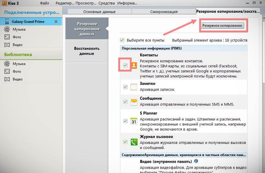 - Выберите «Резервное копирование», выберите «Контакты» и нажмите на кнопку.