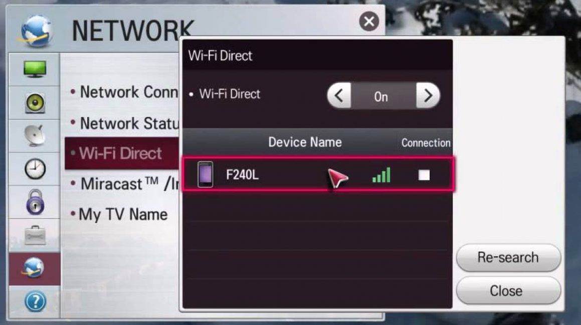 Далее включаем телевизор и в его настройках также ищем Wi-Fi Direct. Отмечаем для сопряжения смартфон после того, как он определится.
