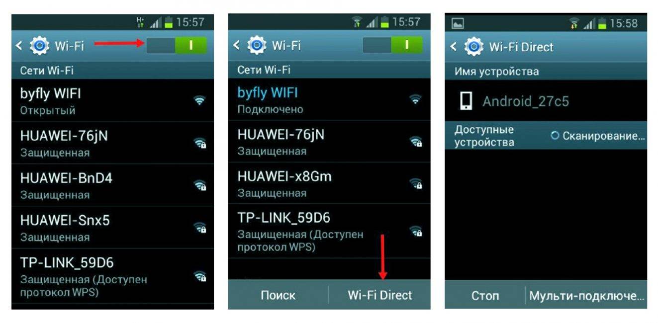 Шаг 2. В своем мобильном устройстве перейдите по пути Беспроводные подключения — Wi-Fi — WiFi Direct (на самом деле, проблемы могут возникнуть уже на данном этапе, так как не все даже современные смартфоны имеют эту функцию и решить проблему так или иначе невозможно);