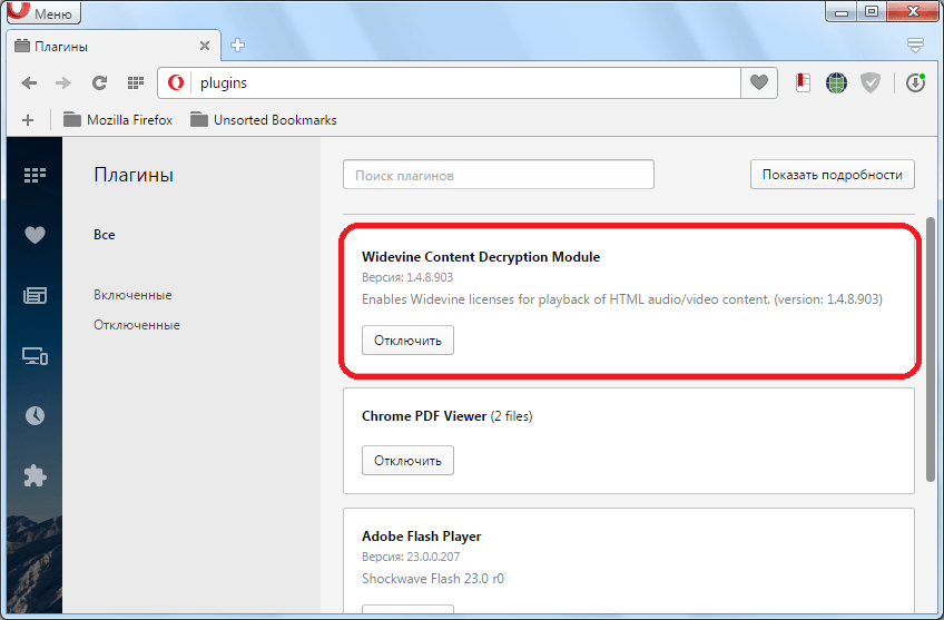 Плагин Widevine Content Decryption Module, как и предыдущий плагин, дополнительно устанавливать не нужно, так как он предустановлен в Оперу. Его особенностью является то, что этот плагин позволяет транслировать видео, которое защищено от копирования по технологии EME.