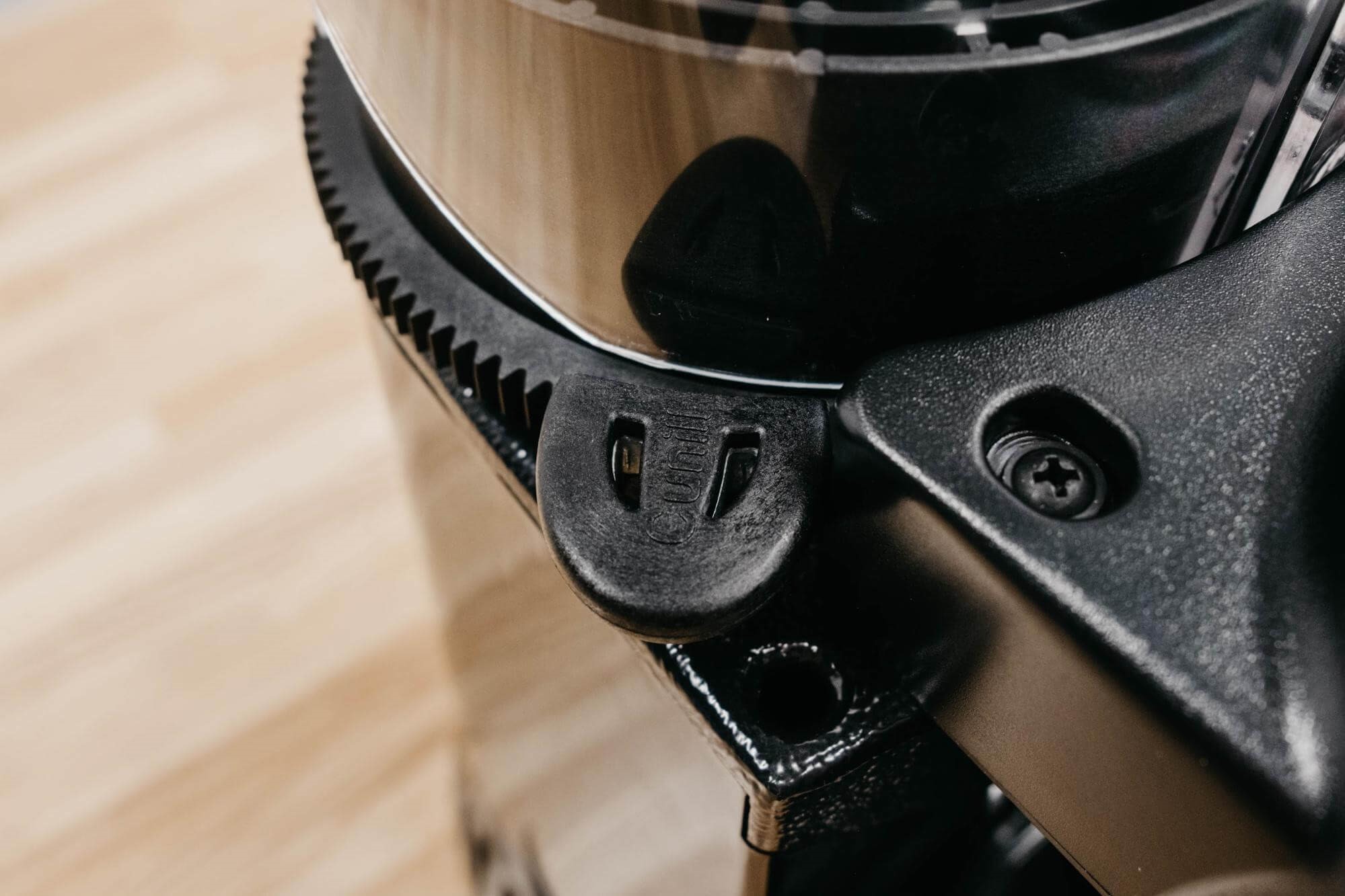 - Для освобождения электрического двигателя кофемолки, потребуется сдвинуть кольцевой элемент и выкрутить фиксирующие болты, к которым откроется доступ.