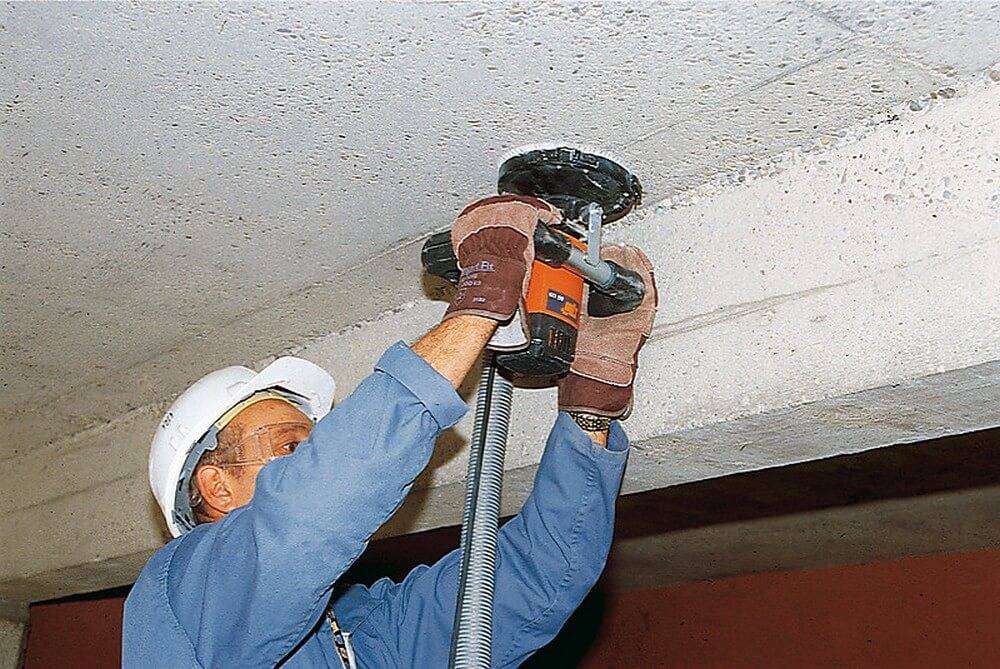 Существенно ускорить и облегчить снятие краски с потолка можно, вооружившись болгаркой с лепестковыми дисками, шлифовочной ленточной машиной (вибро исключить) и шкуркой (зерно – 40-80). Поверхность будет очищена качественно и за короткий срок, при этом дополнительная затирка не потребуется. Для примера можно посмотреть фото. В качестве основных недостатков выделяется большое количество пыли, длительное удерживание статичного положения, высокая стоимость оборудования.