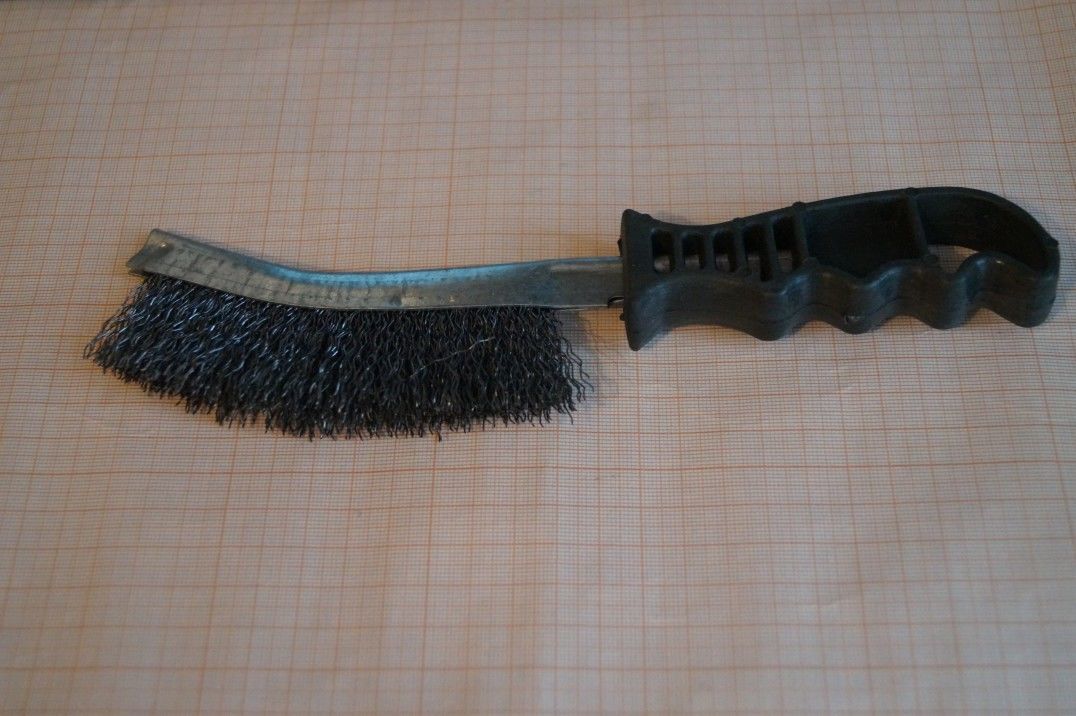 - Нам понадобится щетка с жесткими зубцами из металла. Щеткой необходимо проделать глубокие борозды в лакокрасочном слое.