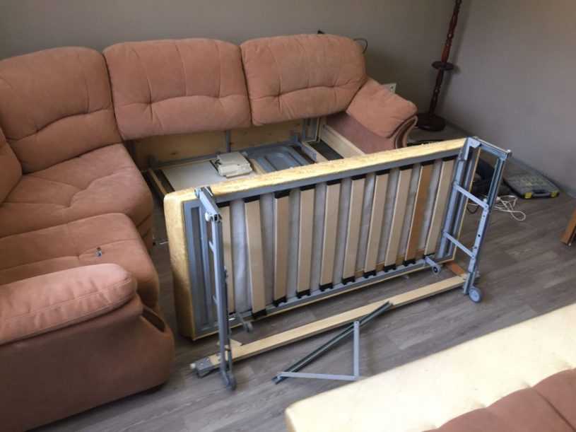 - второй собирают меньшую часть углового дивана, спинку при этом оставляют нетронутой;