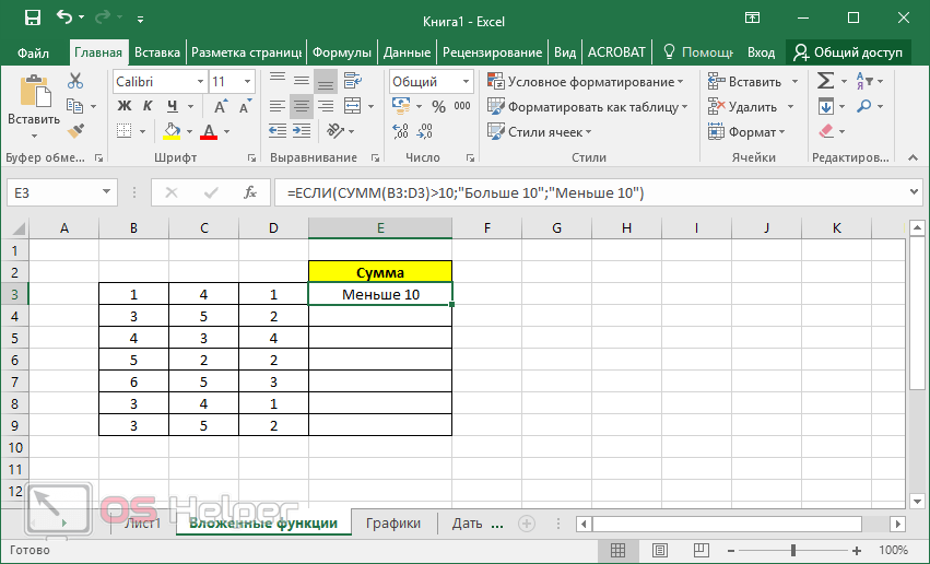 =ЕСЛИ(СУММ(B3:D3)>10;»Больше 10″;»Меньше 10″)
