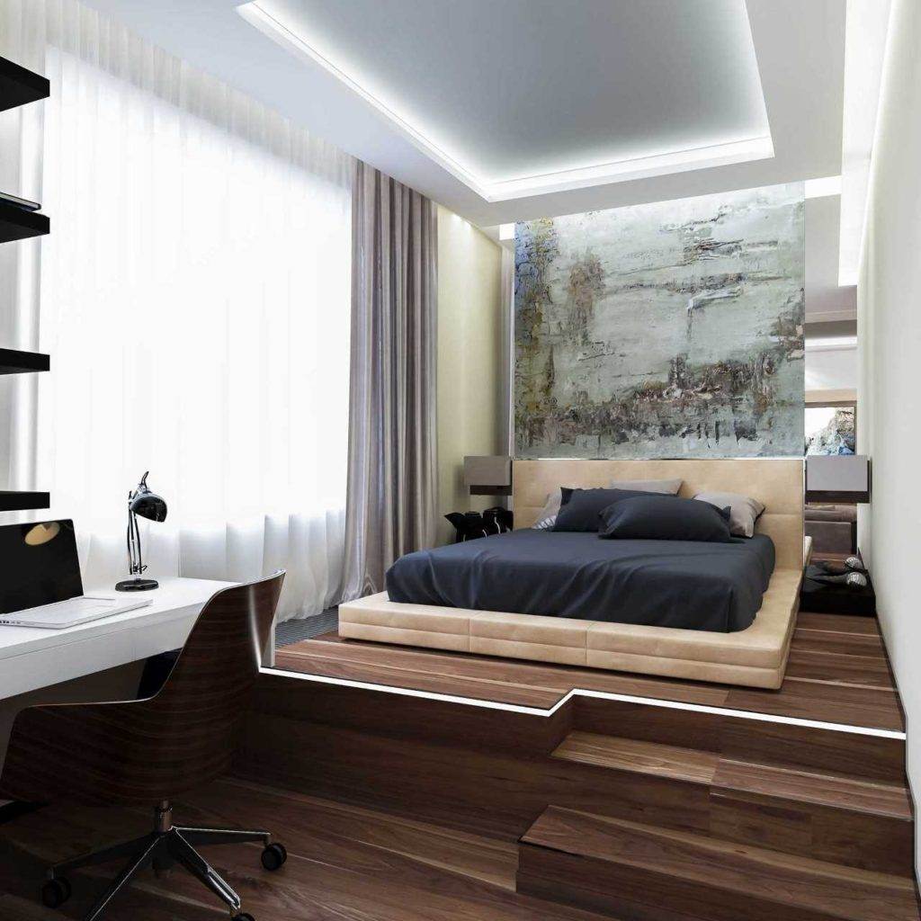 Даже возвышение в 15-20 см визуально отделит спальную зону. Для большей уединенности можно использовать балдахин или фальш-перегородки. Кстати, в подиуме можно предусмотреть и места для хранения – выдвижные ящики и полки.