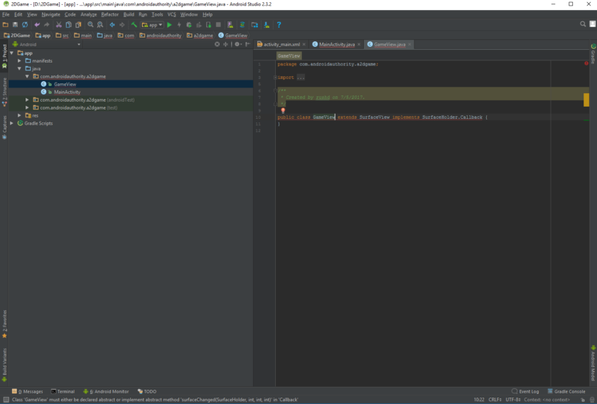 Это в основном позволяет нам переопределять (отсюда и название) методы суперкласса (SurfaceView). Теперь в вашем коде больше не должно быть красных подчеркиваний. Ницца.