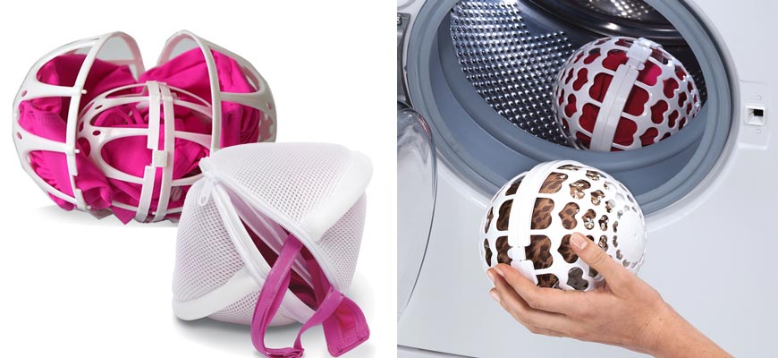 Способ применения достаточно прост: нужно поместить бюстгальтер внутрь, защелкнуть замок. После этого шар отправить в барабан и активировать программу.