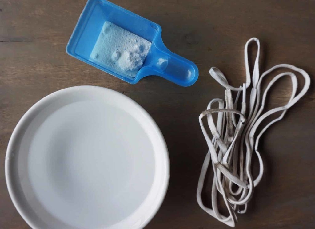Если на шнурках остались въевшиеся пятна грязи, отбеливают их вручную щадящими средствами для отбеливания. Используют как химические средства (не содержащими хлор), так и проверенные временем народные средства.
