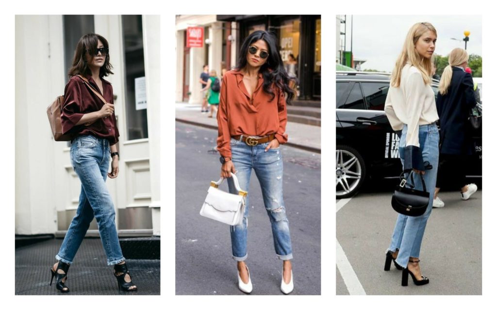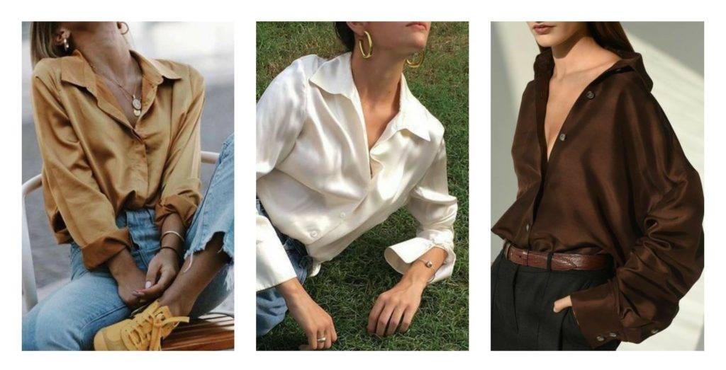 Сочетание шелковой блузки с более демократичными низами (джинсы, хлопковые чиносы, треники, брюки-карго…) лучше поддержать соседством более элегантных женственных аксессуаров, будь то сумка или обувь. Так образ будет выглядеть более целостным и завершенным.