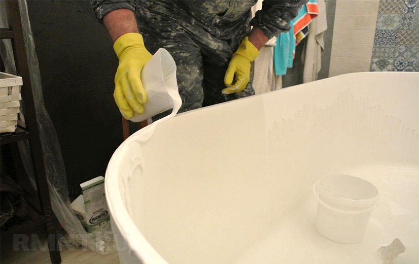 Опорожнённая ёмкость ставится под сливное отверстие ванны, из другой акрил разливается тонкой полосой по бортам. Рекомендуется сперва разогнать состав кистью с натуральным ворсом и хорошо смочить борта с отворотами, чтобы не допустить переливания дорогой эпоксидки наружу. Впоследствии будет достаточно лить состав на самый внутренний край, добиваясь максимально равномерного растекания по стенкам.