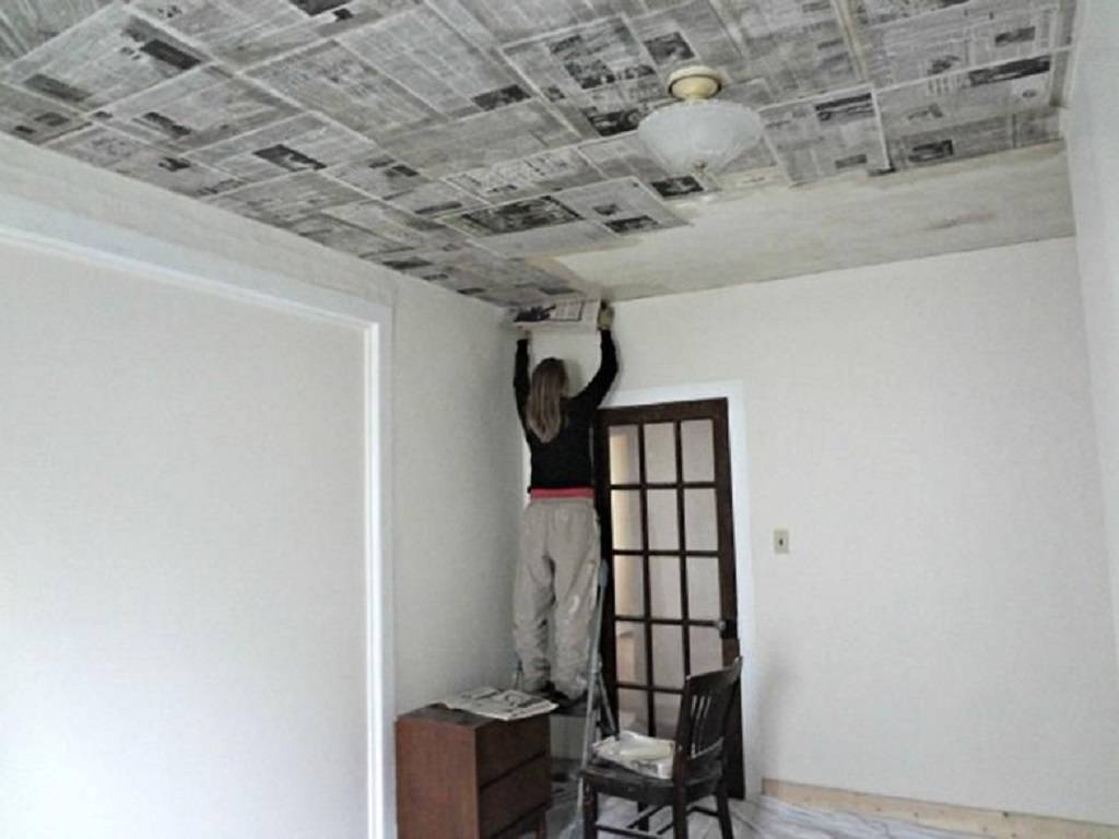 Если дома скопились старые газеты или другая ненужная бумага, для снятия побелки можно использовать их. Газеты приклеивают к потолку, оставляя неприклеенными уголки, чтобы потом было удобно взяться, когда клейстер высохнет — бумагу отрывают резким движением вместе со слоем старой краски.