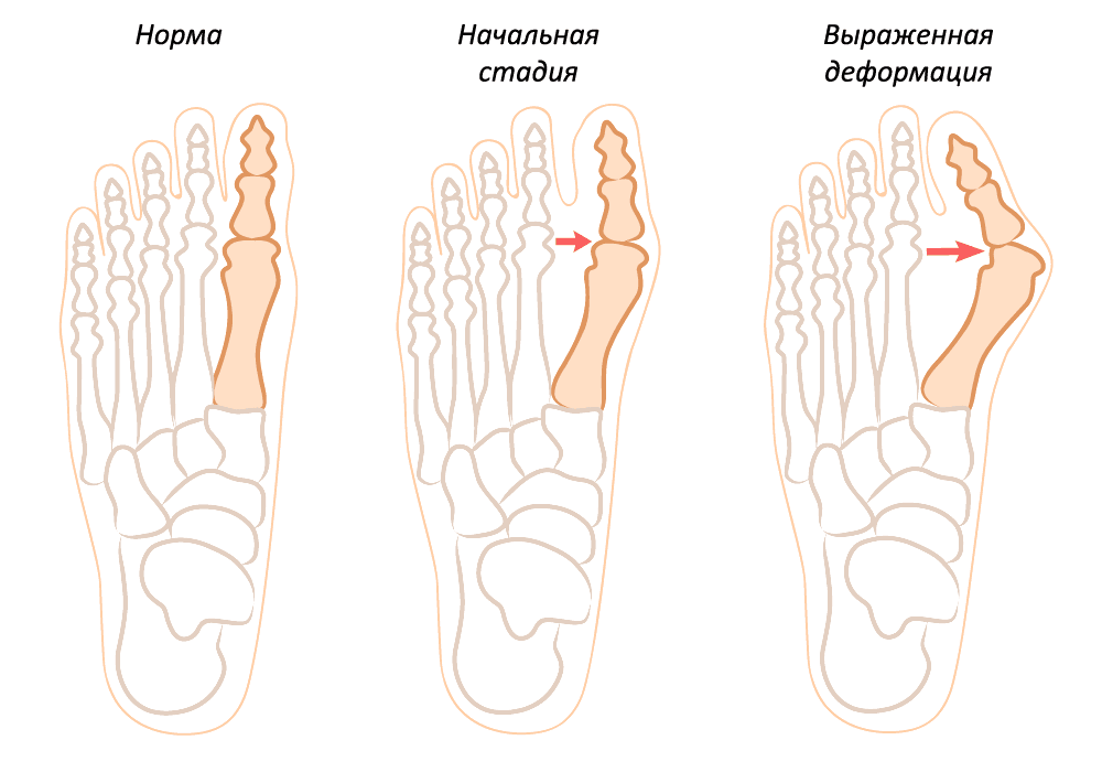 Принято выделять четыре степени халлюс вальгус, в зависимости от угла отклонения большого пальца: