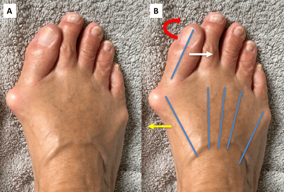 Но при ношении узкой или неудобной обуви (особенно на слишком высоком каблуке) вес тела распределяется неправильно. Всё это приводит к деформации стопы (распластыванию) и поперечному плоскостопию. В результате первый палец деформируется, сгибаясь под углом в сторону остальных.