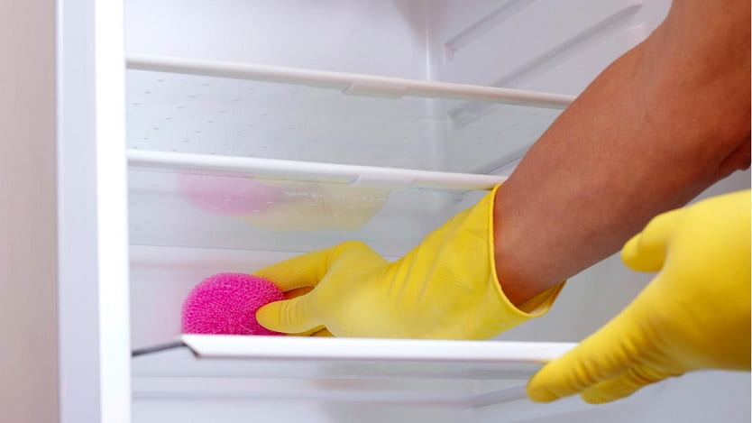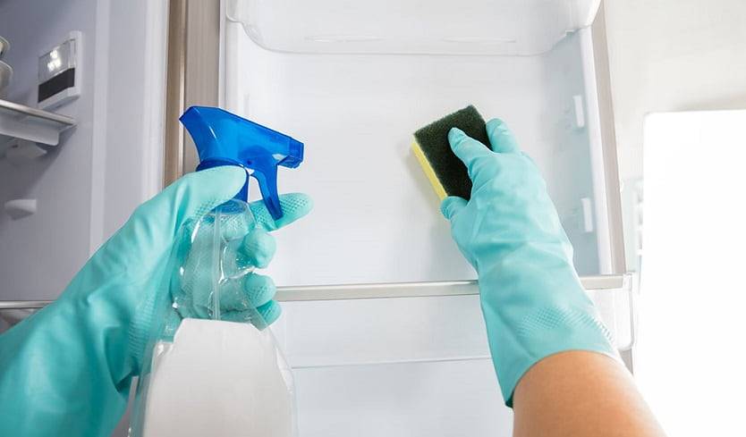 Защитите руки резиновыми перчатками и начните протирать холодильник тряпкой смоченной в выбранном вами составе (в неразбавленном виде). Также вы можете залить средство в пульверизатор и оросить им каждый уголок.