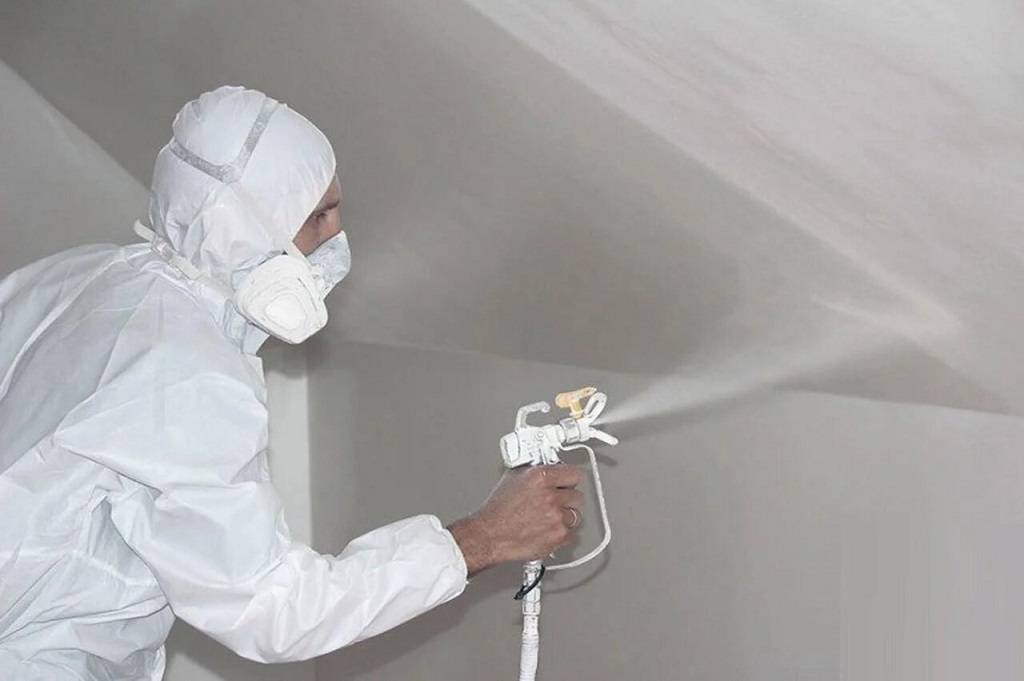 - полученным раствором обрабатывается рабочая поверхность. Не распыляйте состав сразу на всю поверхность. Потолок обрабатывается постепенно, по 3 или 4 квадратных метра;