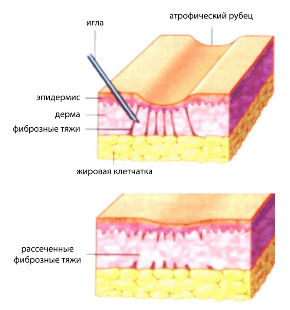 В частности, очень актуальна субцизия. Процедура позволяет избавляться не только от атрофических рубцов постакне, но и от глубоких кожных складок. В этом случае при помощи иглы проводится разрушение соединительнотканных волокон, которые стягивают “дно” шрамового образования.