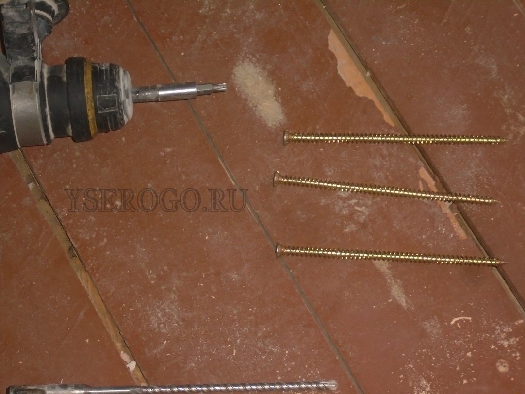 Длина этих саморезов должна быть равной длине от верхнего края чистового напольного покрытия до бетонного основания или немного больше.