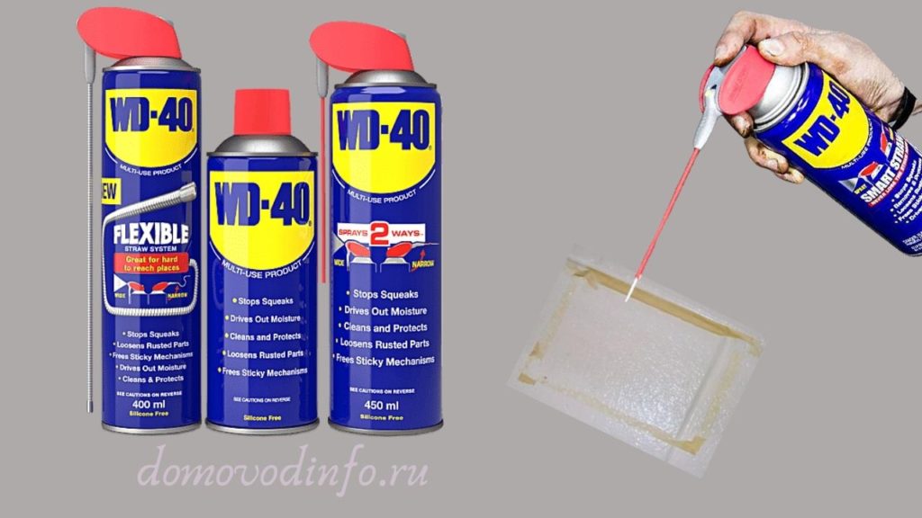 Универсальное средство часто применяют дома, чтобы очистить металл от коррозии; расстегнуть заклинившую молнию; удалить жвачку с джинсов; убрать царапины на деревянных покрытиях и т. д. Спрей, содержащий минеральные масла и уайт-спирит, легко избавляет от липучих остатков. Для этого ленту или поврежденную область опрыскивают. Обработанный участок полируют мягкой тканью.