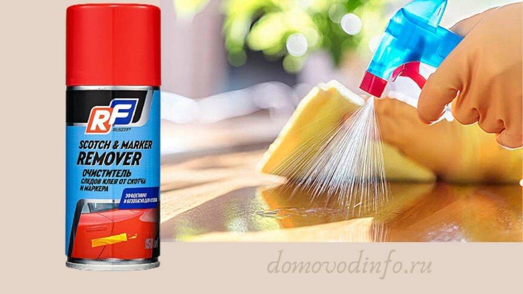Очень удобное средство в формате спрея, которое можно найти в отделах бытовой химии в крупных магазинах. Цена – около 400 рублей, но при этом следы от скотча устраняются буквально за 30 секунд, нужно лишь побрызгать их и потом стереть мягкой тряпочкой.
