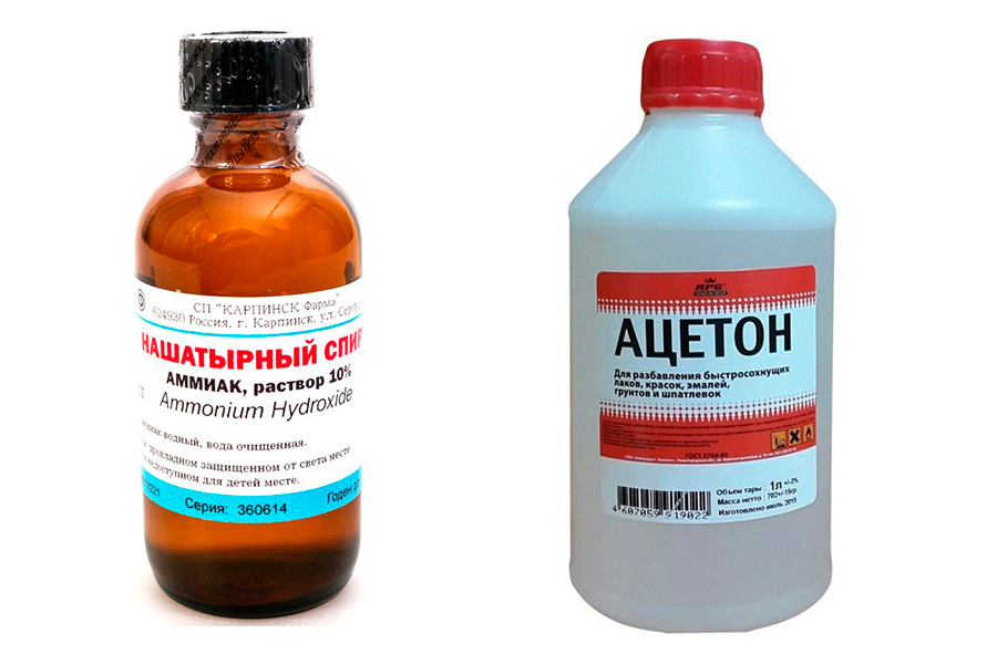 смесь нашатырного спирта и ацетона (2:1). Наносят на проблемный участок кистью или тряпкой. Должна появиться пена, означающая начало реакции. Выдерживают 20 минут и удаляют остатки чистой ветошью;