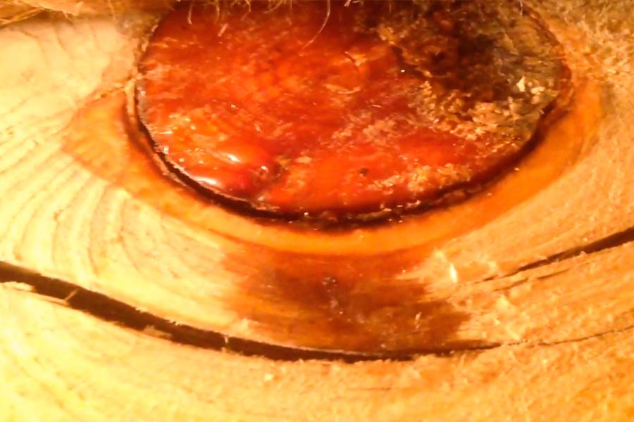 Смола активнее выделяется из нагретых досок. Если баню хорошенько протопить, загустевшая живица станет жидкой и начнет вытекать из смоляных мешков и карманов.