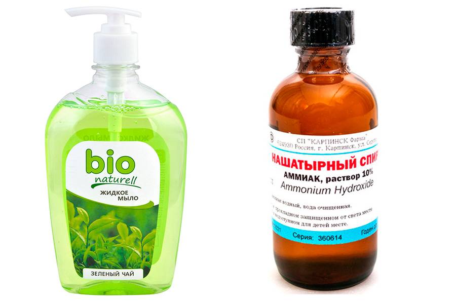жидкое мыло (25 г) смешивают с нашатырным спиртом (50 г), растворяют состав в 1 л воды и обрабатывают проблемный участок.