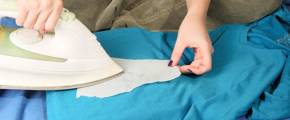 Возьмите две бумажные салфетки. Одну из них положите на внешнюю часть одежды, на которой образовалось липкое пятно, а вторую – на внутреннюю