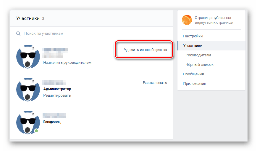 Здесь вам нужно самостоятельно удалить каждого участника с помощью ссылки «Удалить из сообщества».
