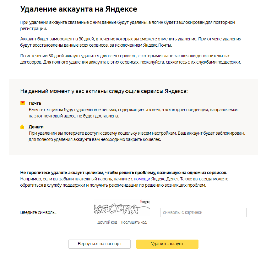 | Удаление вместе с почтовым ящиком | 1. Зайти в настройки аккаунта. 3. Перейти во вкладку «Паспорт», на страницу управления профилем. 4. В самом низу страницы нажать на кнопку «Удалить аккаунт». Затем ввести пароль и ответ на контрольный вопрос, обозначенный при регистрации профиля. 5. Внимательно прочитать предупреждение. 6. Вписать в нужные поля регистрационный пароль и капчу. 7. Подтвердить действие. 8. Если удаление кошелька произошло, система перенаправит пользователя на главную страницу сайта. Аккаунт не будет окончательно удален еще 30 дней, в течение которых можно отменить удаление. При отмене удаления данные всех сервисов, кроме Яндекс.Почты будут восстановлены. |