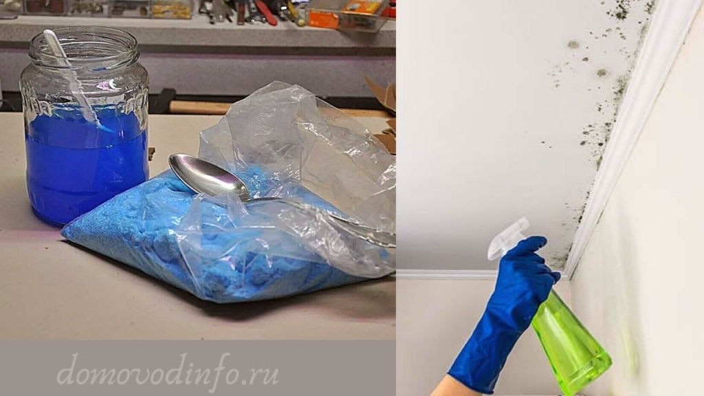 Разведенный медный купорос для обработки стен залейте в краскопульт или бутылку с пульверизатором. Густо обработайте все пораженные места. Если распылителя у вас нет, воспользуйтесь обычной кухонной губкой. Спустя 3–5 часов во всех обработанных местах следует еще раз распылить медный купорос от плесени.