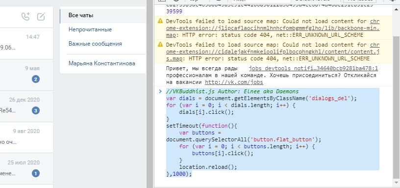 - Зайдите в «Мессенджер» (https://vk.com/im) и нажмите F12. Вставьте в открывшееся окно скрипт и нажмите на кнопку «Enter».