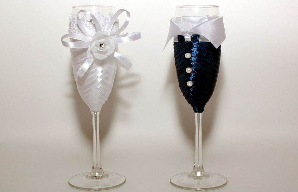 Как украсить свадебные бокалы своими руками самостоятельно лентами?