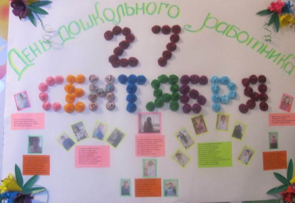 Поздравить любимых воспитателей можно с помощью красивой стенгазеты, подготовленной детьми дошкольного возраста и их родителями, которая в последующем будет украшать стены актового зала в детском саду.