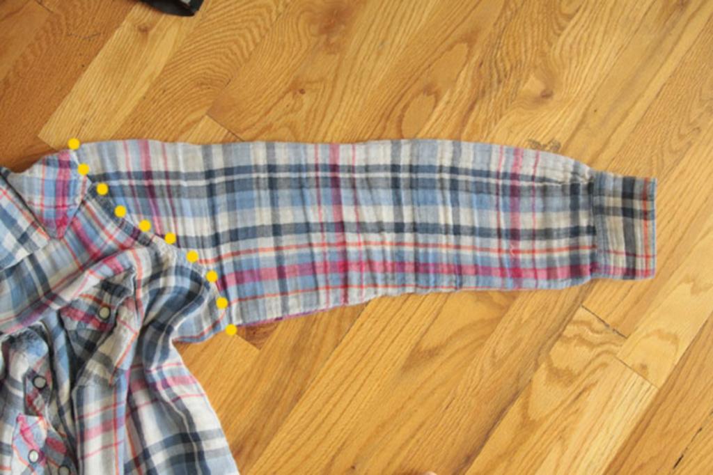 Теперь нам нужно укоротить рукава. Положите рубашку-ориентир на стол, на этот раз расправив рукав. Вы увидите, что на шве проймы рукав имеет S-образную форму.