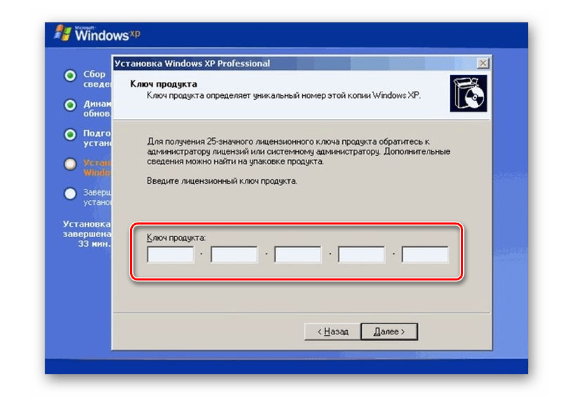 На этом наша установка подошла к самому интересному моменту. Нужно ввести лицензионный ключ активации. Взять код можно из текстового документа, который будет в torrent-раздаче вместе с самой Windows XP Pro.