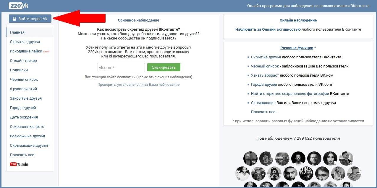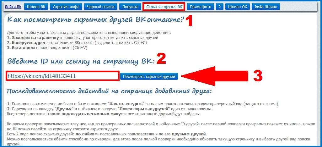 Ещё один популярный сервис, работающий аналогично 220ВК. Он позволяет посмотреть, кого скрывает выбранный пользователь. Для получения информации о спрятанных друзьях выполняем такие действия: