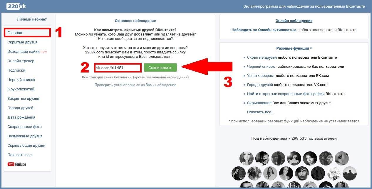 Помимо всего прочего, существуют и бесплатные площадки, которые помогут в довольно короткие сроки отследить скрытых пользователей, находящихся в касте друзей у того или иного человека. Одна из таких площадок – это 220vk.com (верхнее изображение). Тут все предельно ясно и так же просто. Заходим на главную страничку ресурса. Тут же видим поле, куда необходимо вставить ссылку на страничку отслеживаемого юзера (или идентификатор профиля). Вставили ID. Кликнули по кнопке с надписью: «Сканировать».