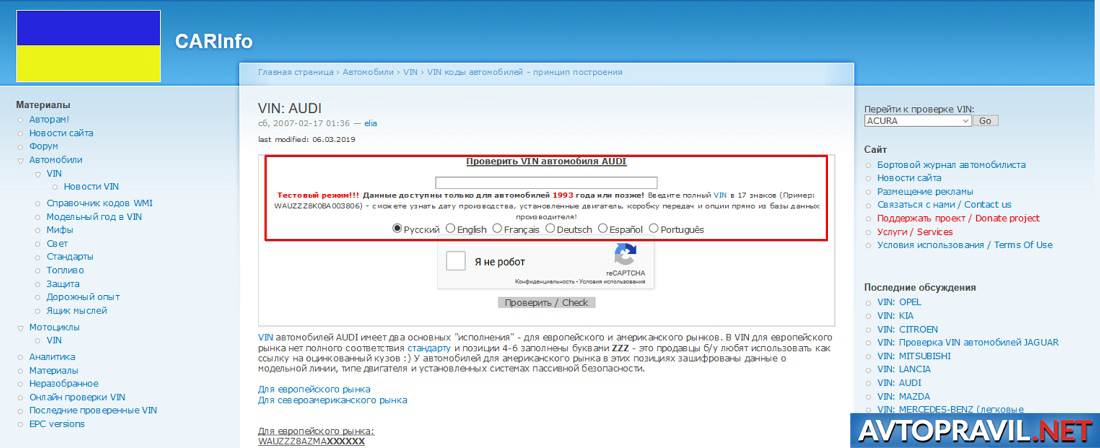 Определить комплектацию при помощи интернет-сервисов намного быстрее. Для этого следует лишь вбить VIN-код автомобиля в соответствующее поле и нажать кнопку «Проверить авто».