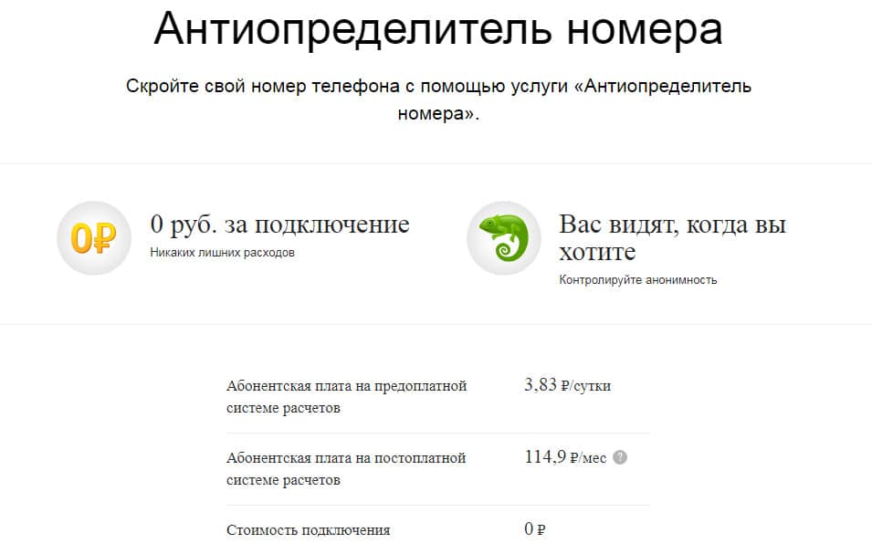 Услуга антиопределителя является платной, ее стоимость составляет от 3,77 рублей в день до 88 рублей в месяц, в зависимости от вашего тарифного плана – подробности вы можете уточнить в службе поддержки.