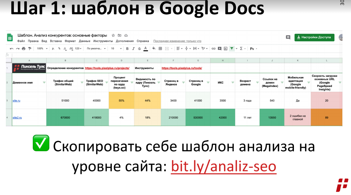 Если конкуренты были найдены с помощью «Анализа видимости и конкурентов», то показатели уже определены, вам нужно просто скопировать их в таблицу.