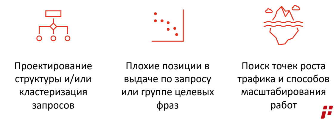 Третья типовая задача — обнаружение точек роста трафика и способов масштабирования работ. То есть вы что-то сделали, но понимаете, что это не предел того, что можно получить из сайта и органической выдачи. Канал поискового продвижения — номер один по объемам привлечения трафика и продаж для e-commerce, сайтов услуг. В Пиксель Тулс есть исследования, подтверждающие это на большой выборке. Если для вас это не канал номер один, то вполне возможно еще есть куда копать.