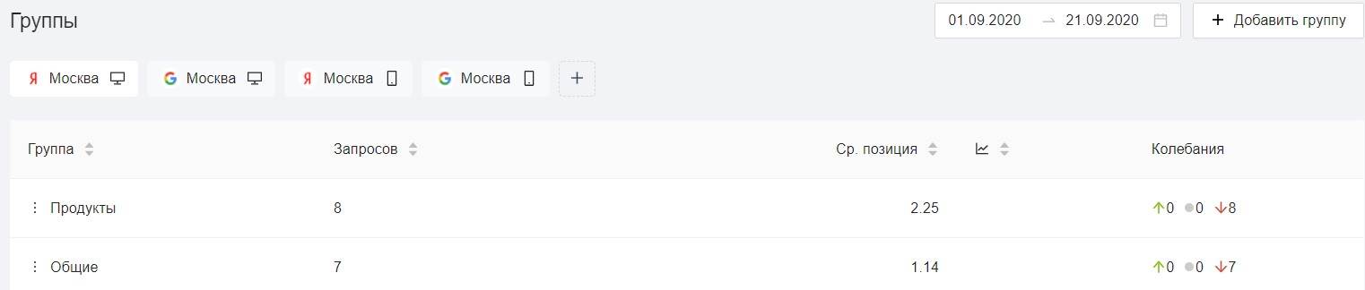 В отчете Группы можно следить за динамикой выделенных вами групп запросов: