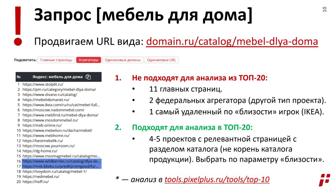 Оказывается, что большинство конкурентов не подходят для анализа. Основываясь на их данных, нельзя сделать выводы. В данном случае не совпадают типы страницы (11 главных страниц нам не подходят, так как мы продвигаем внутреннюю страницу каталога), в выборке есть два федеральных агрегатора — например, IKEA (игрок мирового масштаба), который по факторам близости максимально далек от нас. Таким образом, из ТОП-20 только 4-5 проектов имеют релевантную страницу, близкую к нашей. Не корень каталога, а именно тот тип, который мы хотим анализировать.