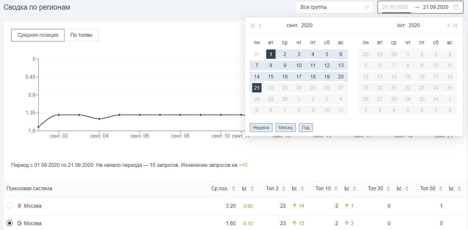 В разделе Отчеты находится график изменения средней позиции по всем запросам. Вы можете сами отметить на календаре справа, какой временной диапазон вам интересен: