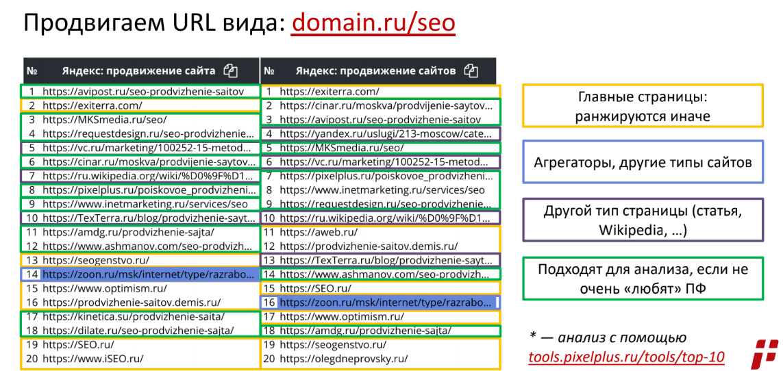 Этот спектр потребностей пытается удовлетворить любая поисковая система, что нужно уметь анализировать. Многие противники анализа ТОП, назовем его «анализом ТОП в лоб», жалуются на то, что не знают, что анализировать. Они берут страницу из Википедии, усредняют со страницей про продвижение сайта https://vc.ru, главной страницей какого-нибудь проекта, не понимая, какие выводы можно сделать. Именно так делать и не нужно, при таком подходе анализ не работает.
