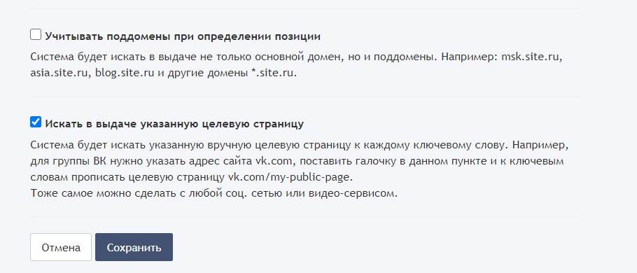 Если у сайта есть поддомены и вы хотите, чтобы сервис прибавлял к данным и их результаты, поставьте галочку у пункта «Учитывать поддомены при определении позиции».