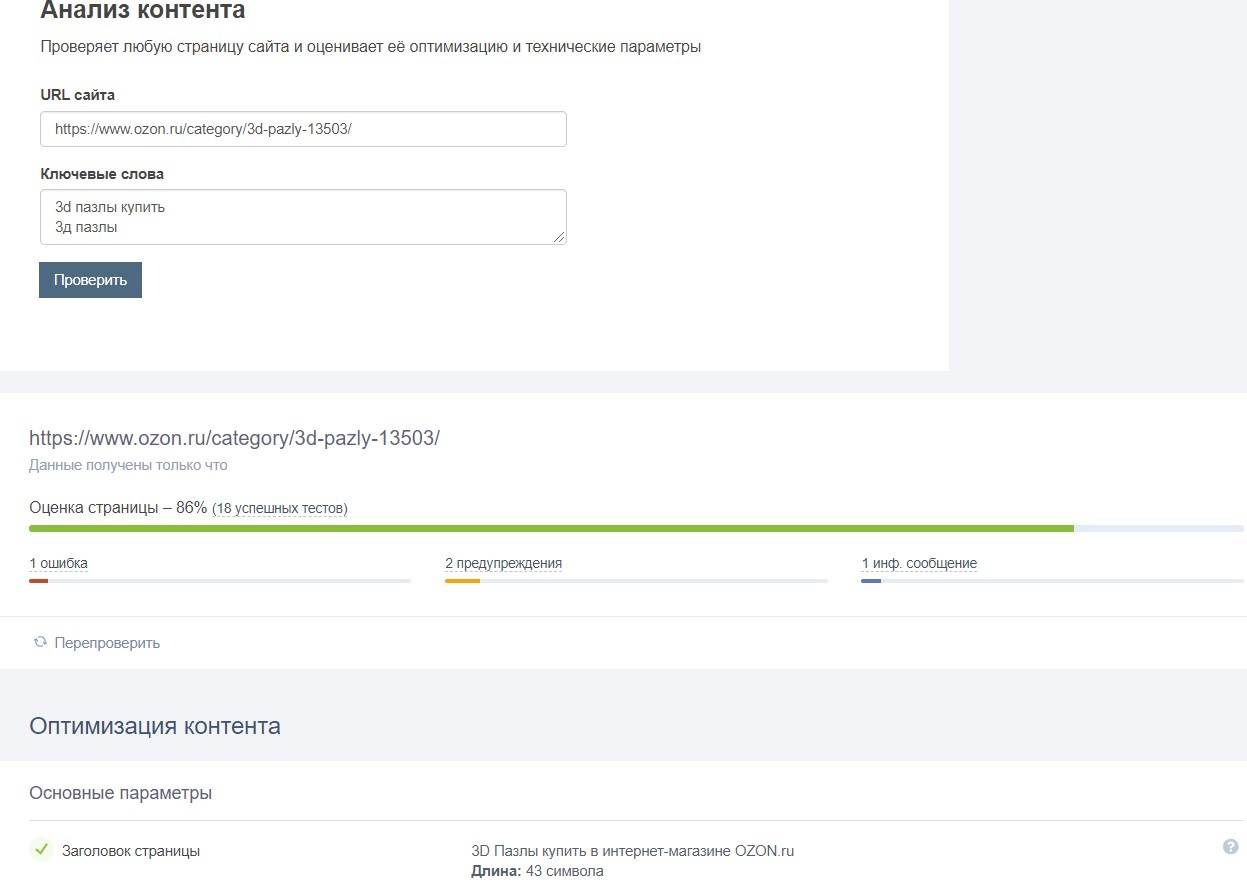 По одному клику можно проверить оптимизацию конкретной страницы в инструменте Анализ контента, это бесплатно. Инструмент оценит текст страницы, мета-теги, ее вес, скорость загрузки, микроразметку, сжатие изображений и другие параметры: