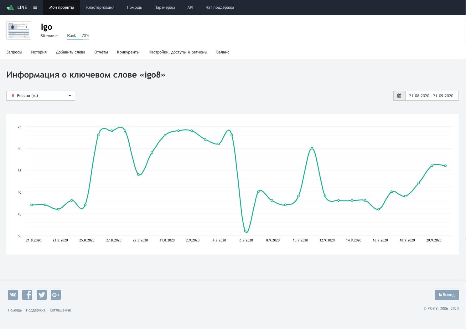 Отдельный сервис для проверки позиций сайтов — line.pr-cy.ru. Он также поддерживает отслеживание изменения позиций отдельно по каждому ключу и по всем ключам в среднем. Кроме того, в нем есть сравнение позиций с конкурентами и кластеризация семантики.