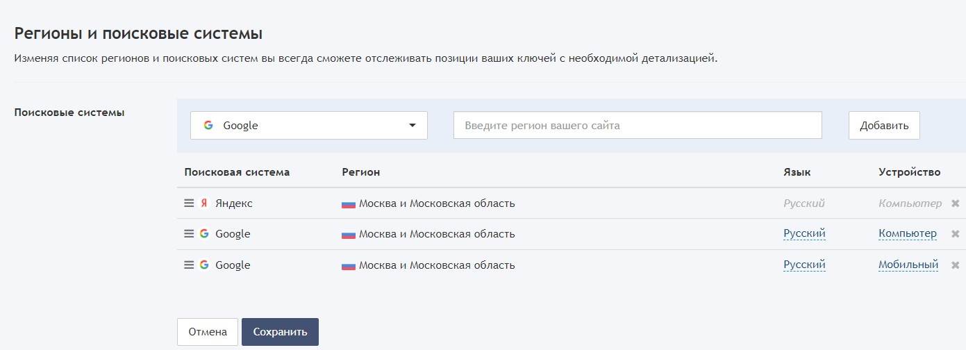 Можно по-разному сочетать поисковые системы, регионы и устройства. Например, для одной ПС настроить отображение десктопной и мобильной выдачи, а для другой только мобильной, если десктоп по какой-то причине не интересен. Сервис покажет данные по отдельности.